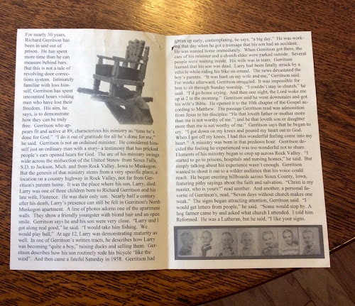 About a year after Dad moved to Michigan, someone from the Muskegon Chronicle contacted him. Wanted to talk to him about his prison ministry. I think pastor Brian Burrel called Clayton Hardiman who was a writer at the paper. Dad asked if I wanted to be there when he was interviewed. Ah, no thanks. I made sure the apartment was spiffy. Had an apple pie and his little 4-cup coffee pot ready so Dad could be a good host. Dad assured me they had a great visit. He had talked about losing his only son Larry, his love for the Lord and fulfilling work at the prison.