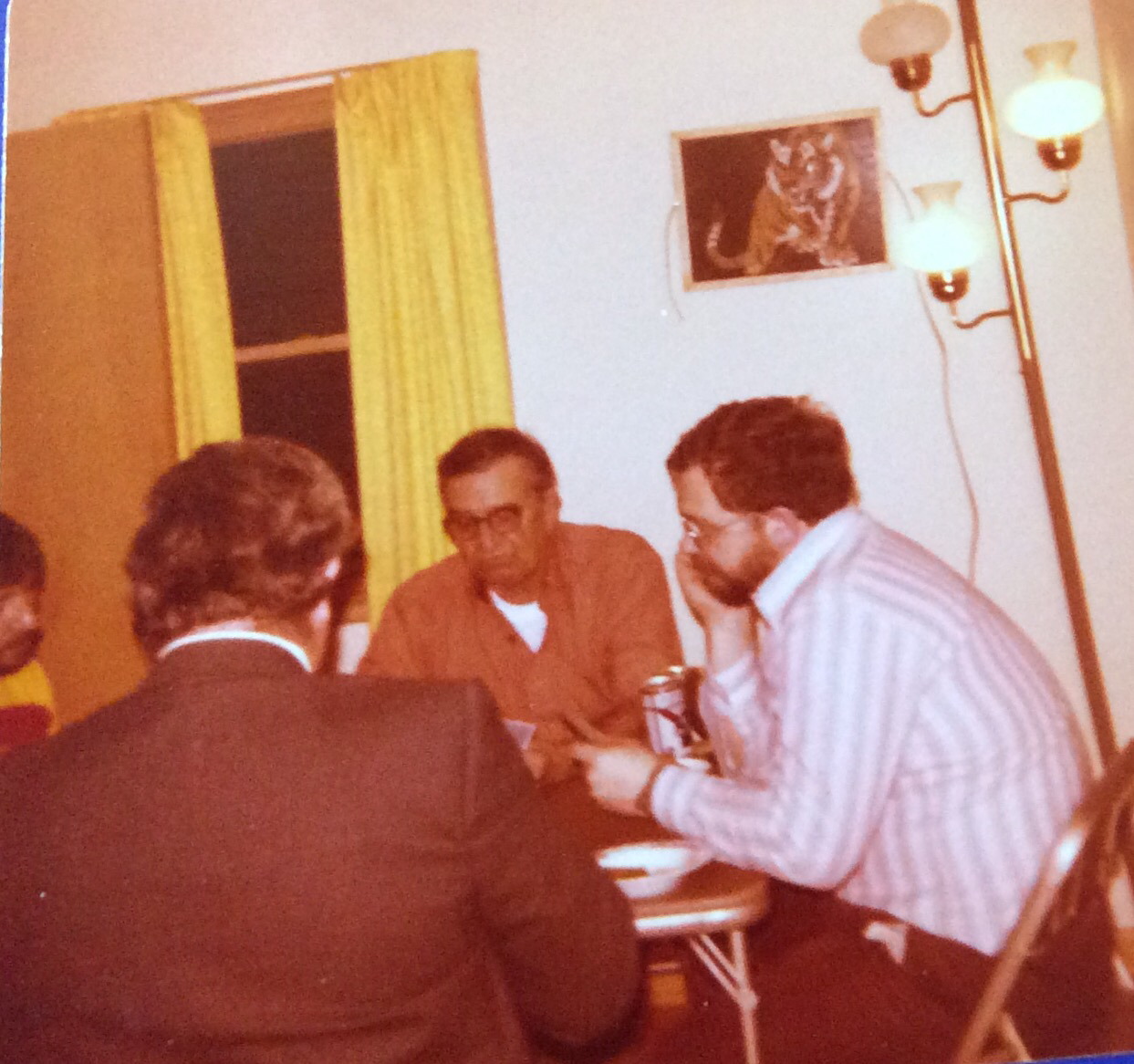 | Arly on left, Jim, John, and Jimmy playing cards in RV, mid ’70’s… |