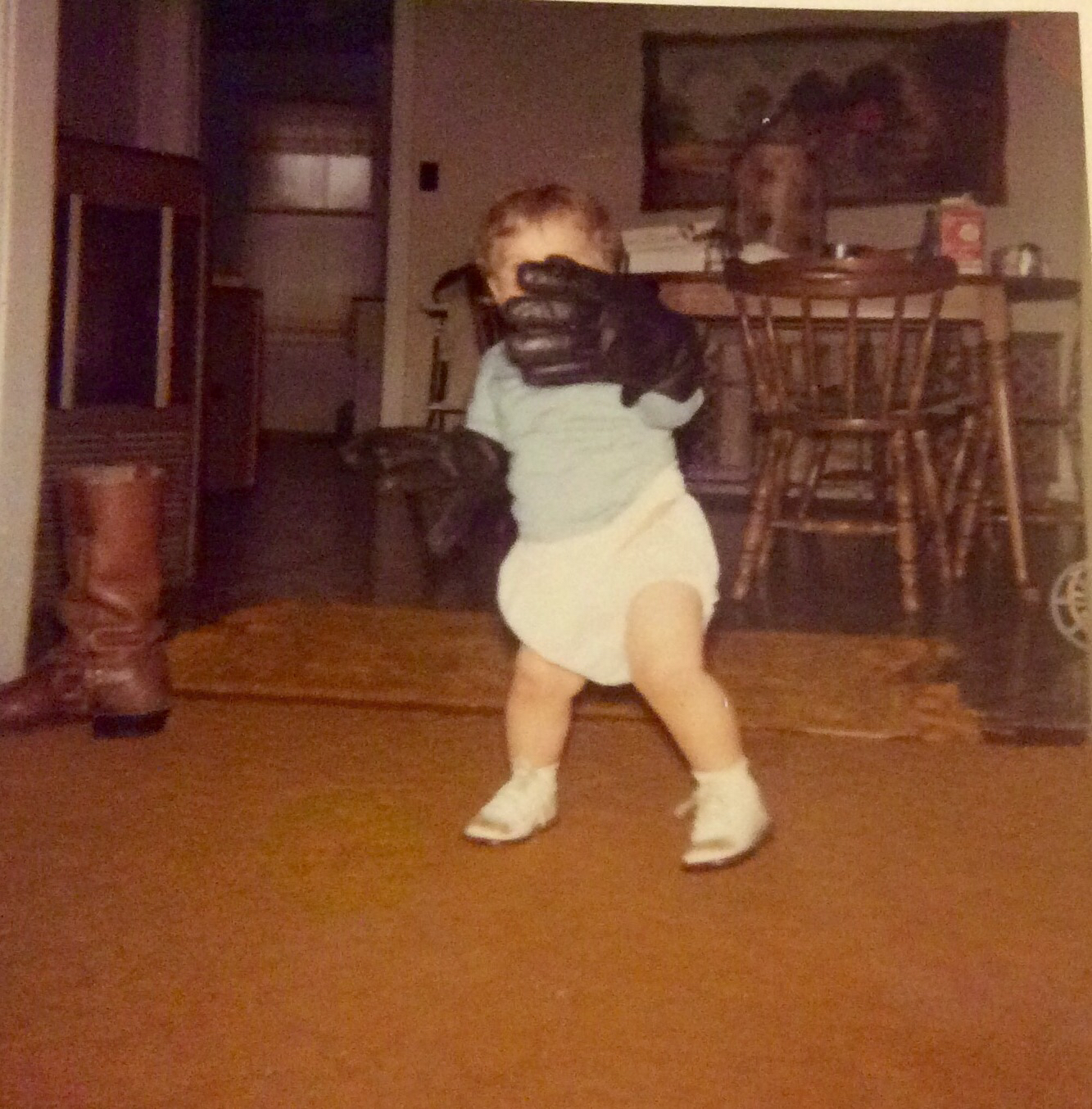 | Scuffed shoes, Daddy’s glove, and a humongous rubber pants, 1971… |