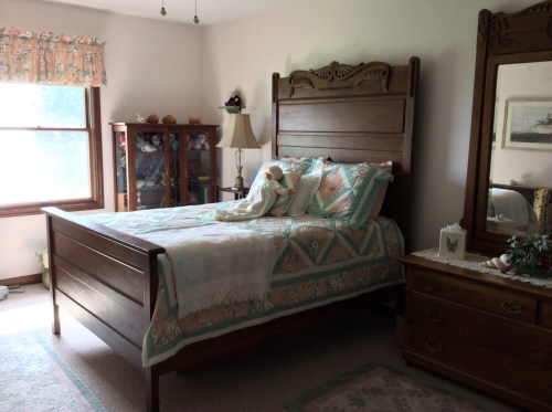 About a dozen antique pieces had been in our former master bedroom (the size of Delaware) for the last 2 decades, so naturally I directed those pieces to be put in what would eventually be our bedroom. But this bedroom is about 1/2 the size as North Muskegon. It filled quickly. Massive oak antiques. I was determined to keep 3 particular pieces besides our king size bed and night stands. A couple of dandy dressers. And I had my heart set on keeping this one big wardrobe. A beauty. Since our spare bedroom is decent sized, I wanted it with our 7 foot oak double bed.