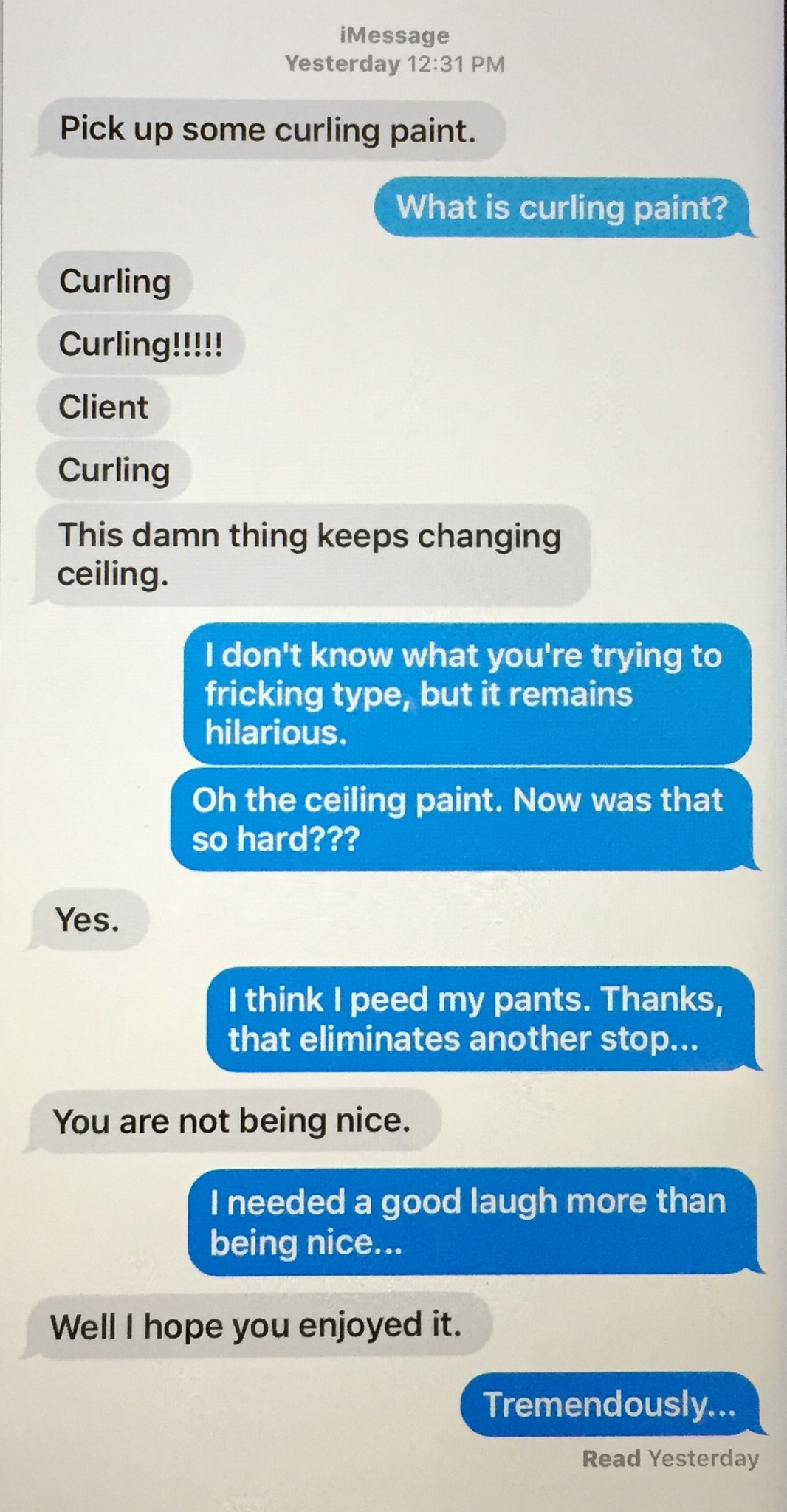 Something that John usually handles is running around. Picking up this, that and the other thing. Well this week, I’ve had to do all the schlepping. Light bulbs, paint, tools, outlet covers, not the most fun shopping. Yesterday was one such trip. I got him settled in his chair with cough syrup, inhaler, hot tea. I zoomed off to get cellular shades and some groceries. As God is my witness this is 5 minutes worth of texts during my little trip between us. Yup, sick as a dog, about 50 years after first laying eyes on him, Hubs continues to make me laugh. At times…