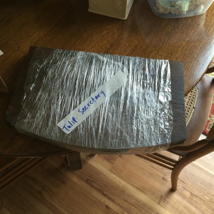 Now after about 60 plus days in our new crib, the ever elusive shelves to my final curved glass secretary have surfaced. For our first month here, all 3 sets of shelves were missing. I had saran wrapped each set of shelves together, but had no idea where they were. I thought they were packed in a slender picture/mirror box. Only the china closet shelves had some substance to them. Curvy, with a beveled edge and plate grooves, both sets to the curved glass secretaries are non-descript. Rectangular and rather plain. At the time, it was just too much work to keep searching for the shelves. Most of the house was looking fairly good. But I was sleeping on the couch and John (sicker than a dog) was in the spare bedroom.