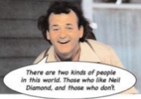 Which reminded me of the best quotes from one of my favorite movies, What About Bob? Bob (Bill Murray) is a psychiatric patient of Dr. Leo Marvin (Richard Dreyfuss). Doc is getting some history on his new whack job patient, and inquires about Bob’s marital status. This is Bob’s response: “there are 2 types of people in this world. Those who like Neil Diamond, and those who don’t. My ex-wife loves him.” Pretty much sumsup my life for me. I’d be Bob’s ex-wife.