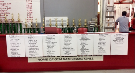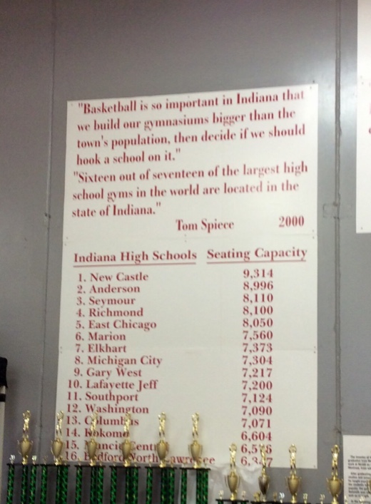 Fort Wayne’s Spiece Fieldhouse (home of the Gym Rats, quirky, love that name) is quite a place. We’ve been watching Landon play there occasionally for about 8 years. It has 7 basketball courts, a private workout gym for paying members, a shop loaded with t-shirts, shoes, and sports gear. But it’s the entrance and signage I find interesting. Everyone knows Indiana is one of the biggest basketball states around. There’s tons of framed uniforms from famous players (Larry Bird) and coaches (Hoosier’s Bobby Knight-I think I’m gonna be sick) hanging as you walk in the building. Plus a quote from the Fieldhouse owner Tom Spiece, bragging about the size of Indiana’s high school’s gyms. Funny.