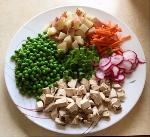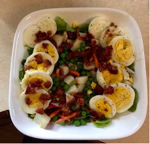 Anyway, I’ve decided pretty much for taste and a nice visual effect, my summer layer salad will include: garden lettuce, shredded carrots, slivered radishes, frozen peas-thawed, diced green onions, chunked fresh mushrooms, sliced hard boiled eggs, diced redskin potatoes, a virtual boat-load of crispy bacon chunks, and dressing. Ta-da.