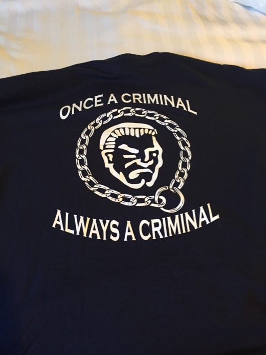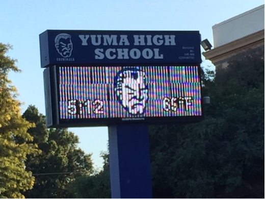 Hubs and I drove to Yuma High School this week. I had become so infatuated with the story behind the Criminals, I decided some ‘Crims wear’ was needed before we head back to Snowsville. We found a parking spot by the front door with a huge lit sign sporting Yuma High School—Proud Home of the Criminals. Wandered around, finding nothing close to an office or administration. Just classrooms filled with students-er-Criminals. As far as we could tell there was a severe lack of security-had we been up to no good.