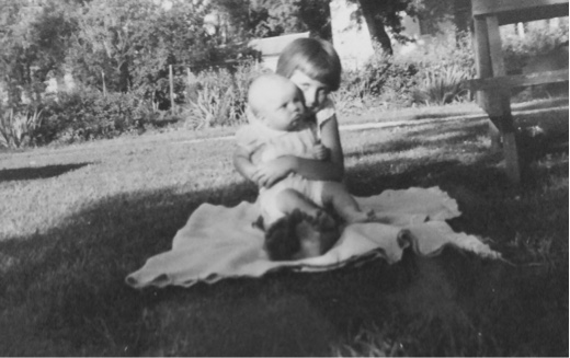 | I admit I haven’t been able to sit on my haunches like this for a decade. Me with neighbor baby Cindy, 1957… |