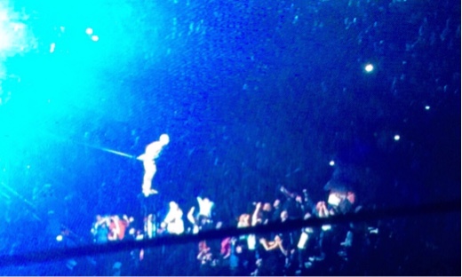 The concert. No opening act and Elton walked out on stage at 8:05. He’s prompt. He starts off with one of my favorites, Ba-Ba-Ba-Benny & the Jets. (I’ve been singing this one since I started working because we’re on our second little boy named Ben). I didn’t recognize another song during the first hour which was disappointing. Elton used the backdrop to show lots of pictures, some sad, some silly about almost everything, people, wild psychedelic images. The second hour had more of my favorites, Rocket Man, Daniel, Crocodile Rock. He only changed clothes (and glasses) twice, basically sang over 2-1/2 hours. After leaving the stage at the end of the concert, he came back out in his dressing gown (what a riot) and ended the night with Goodbye Yellow Brick Road.