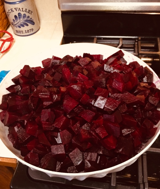Beets are not as temperamental or delicate as most produce. I waited a couple days before I pickled them. You boil them until they’re fork tender like a potato, dump them in the sink to cool, slip off the skins and trim both ends. Then I hauled them to the dining room table so I could sit and dice them. Sigh, yes another first-sitting to dice beets. Then comes the stand up part. The beets go into a delicious syrup which kinda makes your eyes water. Strong smell from tons of sugar and vinegar with a dash of water. (Still the best part of pickling beets. Those little shits actually stink while you’re cooking them. Hubs always finds something to do outside. He hates both smells though, the cooking and pickling part). So ‘ya dump 10 pounds of diced beets into this ginormous vat of syrup so they can simmer for 5 minutes, (which takes a long time to get back to a simmer). But then you’re practically done as you fill scalding hot jars, turn the lids & rings pretty tight and wait for them puppies to seal with that distinctive pop.