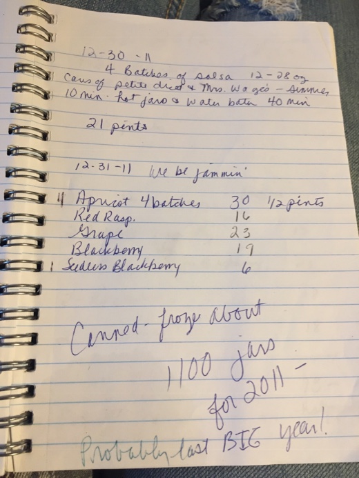 At the peak of my canning frenzy (which only lasted 5 years) my total number of jars canned was between 1,100 & 1,400 jars. For one year. Oh my. If you consider the number of jars we consumed, maybe 100-150 tops, that’s still an awful lot of jars setting around. (I think per chance I was possessed). There’s never been any left over from the previous year. I made and gave away hundreds of jars in gift baskets plus brought a couple hundred jars along to Iowa every year. But I digress. This is not about the actual jars I canned, but about my journaling on canning and my all around decline since 2015. No more wacky sidetrack paragraphs.