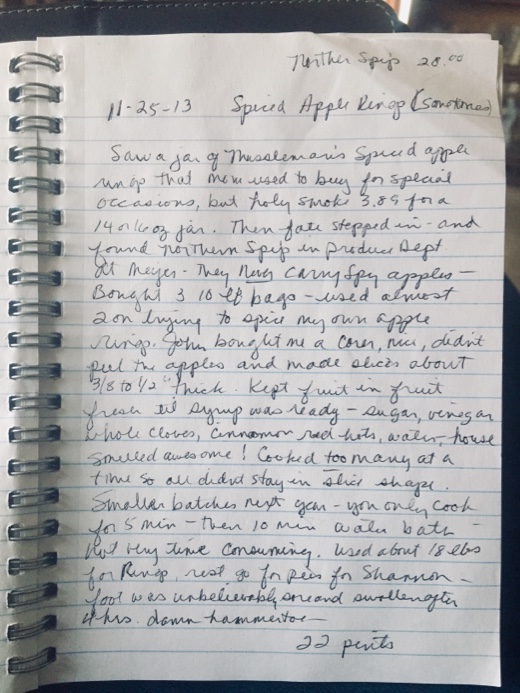 I realize I’m no longer at the top of my game physically. But until a couple of weeks ago, I was working 25 hours a week, carrying around 20 plus pound babies 6 hours a day. Still, how much the last 3 years have affected me is evident by my simple canning journal. I canned a bushel of apples into sauce last week. (Sorry Hildonna, I’m still using a paring knife to peel the apples). First time in my life, I had to sit down to peel the apples, because I’m having issues with my right leg. Ugh. I was optimistic-yet realistic when I drove to the orchard, so instead of buying 1 or 2 bushels of Northern Spy’s for pies, I pared (lame apple peeling joke) down that little number to a half bushel this year for a couple of reasons.