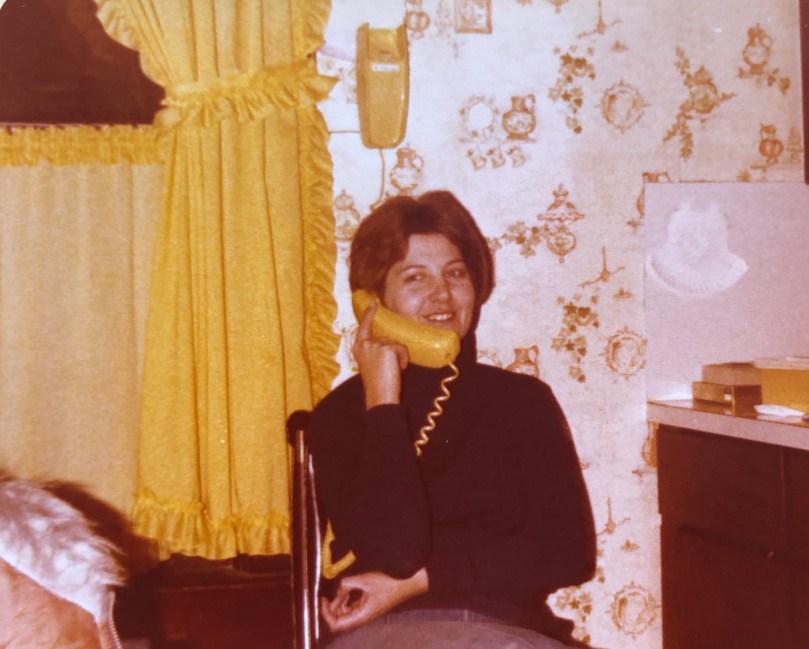 I loved talking on the phone since I was a kid. When you were home, it was your lifeline to the outside world. Plans were made/changed, gossip shared, rumors discussed-stretched or squelched, boyfriends discovered/dumped or embellished, friendships broken or strengthened. Much of my social life was spent on the phone after school or on weekends. When John and I were dating, we’d spend countless hours on the phone at night, after he got home from whatever sport he was participating in. John’s mom & dad’s wall phone (beige) hung inside their back door on the kitchen wall. From there the curly, stretchy cord allowed him access to a spare bedroom or the stairs leading to the basement when he talked. His parents weren’t concerned with our phone romance on nights when we didn’t see each other. Mine were though. Our orange wall phone hung in the kitchen and the cord was not very long, so I was stuck having my conversation by the kitchen table, until they got an extension phone in their bedroom upstairs. This phone was really a necessity because it eliminated one of them running downstairs during the middle of the night if Dad got called in to work when we were having a snowstorm, blizzard or it was so ghastly hot the pavement on the Highway 18 or 75 ruptured (it was called a blowout-a big chunk of pavement would buckle up a foot or so from the heat. A blowout could cause a serious accident and needed to be repaired pronto, although most occurred during the peak heat of the day-5-ish).