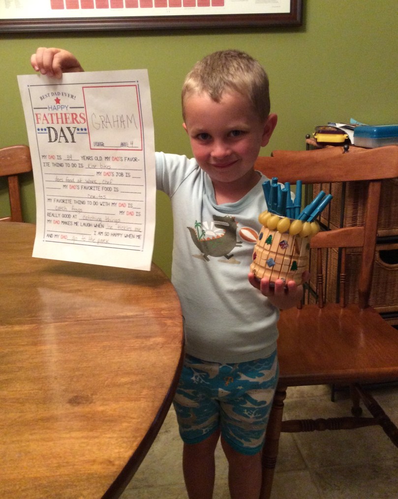 Even though Graham was a little young, he had the patience of Job and our Saturday night craft projects held his interest until he was around 7. By then he was playing outside with neighbor kids and my goofy crafts lost their appeal. (I’m about to start the same ritual with my great-granddaughter Jovi. Should be fun and I’m looking forward to learning lots from her). Of course, many of our craft projects revolved around snacky food ingredients like Twinkies, cupcakes, bananas, Rice Krispy treats shaped into snakes, cupcakes into an enormous centipede, dirt cake that turned my cake pan into a spooky cemetery. But a couple of them, one with clothespins glued on a tin can which made a neat pencil jar I hope mom and dad save for him. My favorite was something we made for Adam for Father’s Day. I took G to one of his and daddy’s favorite spots. A neat park/pond/playground near their home. We brought a bucket along and collected lots of small stones. At home we made a big batch of salt dough, (a favorite staple for craft projects) shaped it into an oval, poked holes on the top so we could hang it and stuck the pebbles in before we baked it. DAD ROCKS. Always have special meaning for both of them since they spent a lot of time at Mill Pond Park where we collected the rocks.