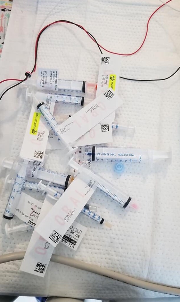 I don’t know all the technical terms but Evy is finally showing off her beautiful face, now completely unadorned of medical paraphernalia. No more yanking out her oxygen. They have transitioned from the intensive care unit to a regular floor. Mom and dad are working with Evy’s team to learn how to give her medications. And there’s a ton of them.