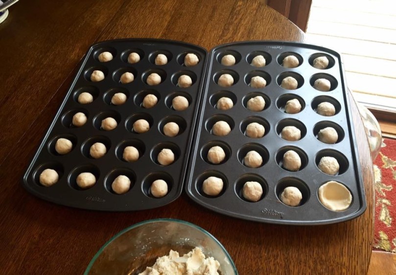 You with me so far? Well here’s the zinger. There’s a lot of kanooey work involved in making these tiny tidbits. I’m sure you’ve seen the specialty pans in kitchen stores. Looks like a cupcake pan except the cupcake openings are half the size. Each is about the size of a large unshelled walnut. Oh for Pete’s sake, how did I ever get snookered into making them the first time? Yup, I was young and dumb.