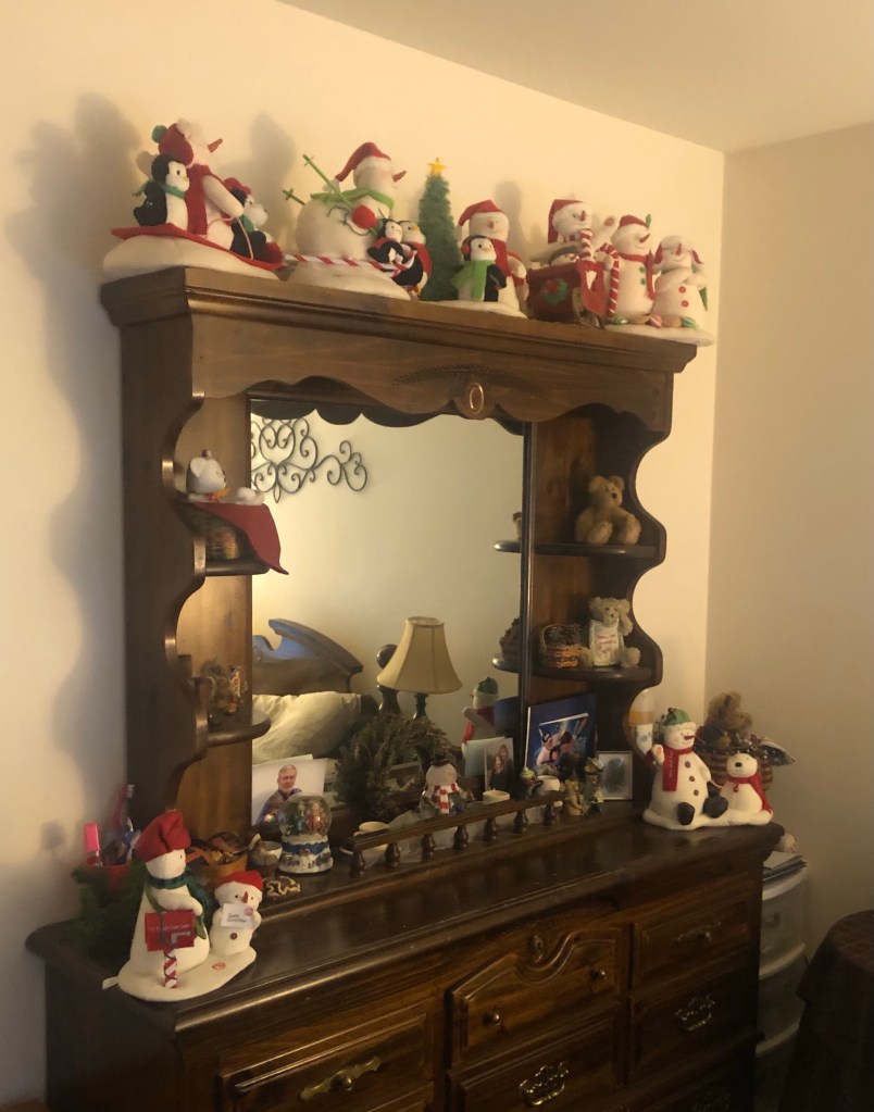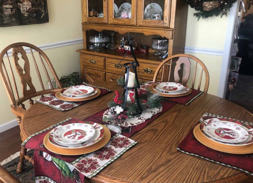 As we hauled in enough bags to give the impression we were staying until 2022, 20 whimsical snowmen greeted us in the guest room. They made me feel all warm and fuzzy. Although I hate snow, I have a fondness for all snowmen. No dallying, it was time to eat. I thought Pat was serving hors d’oeuvres when I sat down at the dining room table. Of course the table was festooned with Christmas dinnerware, placemats, runners and centerpiece. Duh. Jeff patiently explained the logic of 8 different plates topping the charger. Steaks, fried potatoes, green beans, rolls, and salad/slaw and wine. Yup, just a few snackies, as Jovi would say.