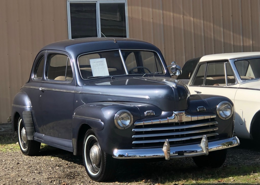 John made an appointment for the day after I got back. I brought my tennis shoes and headphones so I could get my steps in while they talked (and talked & talked some more) about cars. When I got back 45 minutes later Hubs and Phil were huddled together in the office, haggling over the price. I had just spotted this really neat car and tried, (to no avail) to get John’s attention away from the pickup for 2 minutes so I could convince him to buy the car instead. A 2-door, 1947 Ford Deluxe for a grand more than the pickup, but he wouldn’t hear of it. He only had eyes for one vehicle that day and it was baby blue.